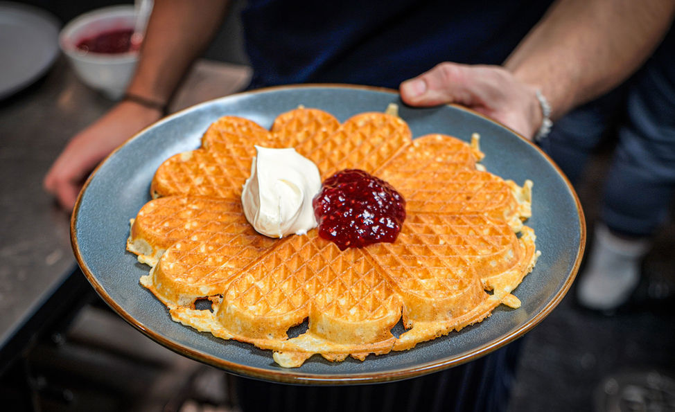 Her serveres enklere retter som grillede burgere, varme drikker og nystekte vafler m.m.